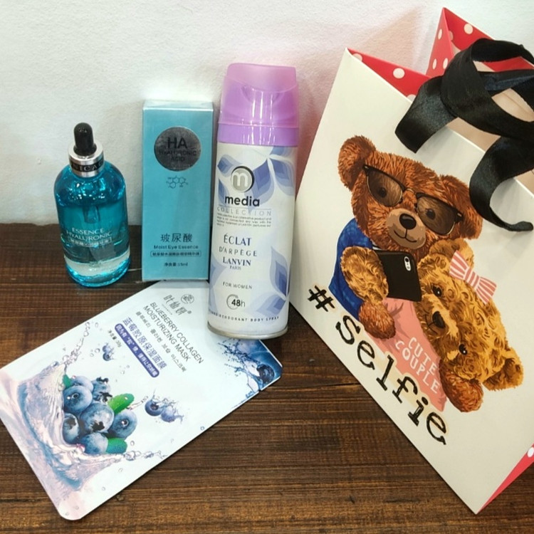 1-اسپری ایکلت ( از پر طرفدارترین رایحه های دنیا ) 2-سرم مراقبت پوست هیالورونیک اسید ویز ( جوانکننده ،کلاژنساز پوست،درخشان کننده،ازبینبرنده لکه و آکنههای پوستی،آبرسان قوی با جذب سریع،تحریک متابولیسم سلولی،جلوگیری از پیری زودرس،افزایش جریان گردش خون،حاوی هیالورونیک اسید ) 3- ماسک صورت بلوبری 4- سرم دور چشم رولی هیالورونیک ( جوان کننده و کلاژن ساز و... جهت دور چشم )