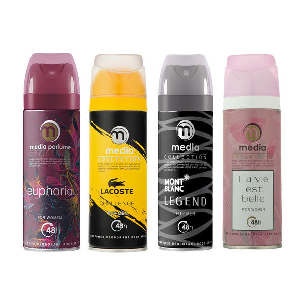 اسپری بدن مدیا در بسته بندی چهار عددی در رایحه های متنوع زنانه و مردانه، با حجم 200 میلی لیتر انتخابی مناسب برای انواع سلیقه ها می باشد. این اسپری با انواع رایحه های: خنک، گرم و معتدل ارائه شده و از ماندگاری بالایی برخوردار است.
