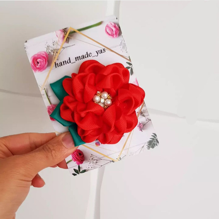 گل سر (گیره مو) دخترانه، طرح گل، کار دست و به صورت روبان دوزی تهیه شده است که ظاهر زیبایی دارد و برای جلو موها و حتی تزیین مو و شنیون مناسب است.این محصول دارای دو رنگ قرمز، زرد می باشد.