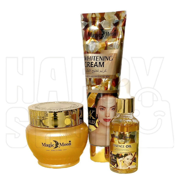 این پک شامل سه محصول: کرم روشن کننده حاوی طلا، کرم شب طلا و سرم طلای مجیک مون می باشد.